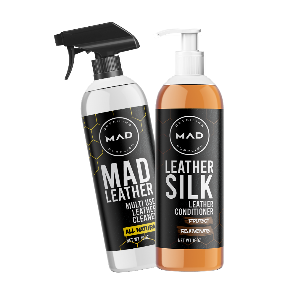 MAD Leather is unlike any other leather cleaner on the market, our gentle leather cleaning technology removes grease, dirt, body oils, food crumbs/residue and sweat stains from natural, synthetic, and sealed leather. Our leather cleaner works hard to bring your used leather seats and surfaces back to Showroom condition. MAD Leather will not stain any leather surfaces or any other surfaces.